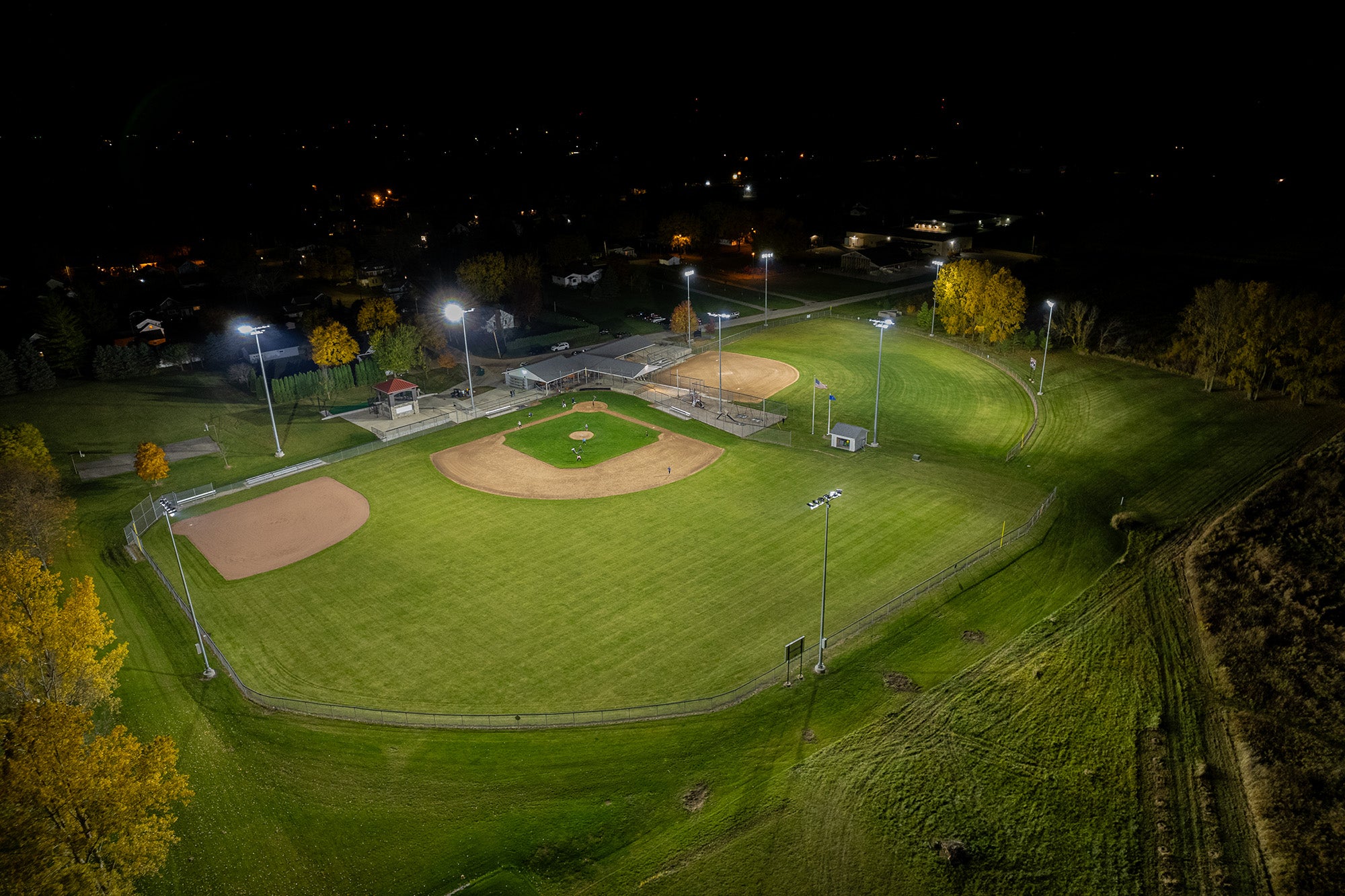 Small town baseball field complex. Multiple fields outfitted for youth + adult sports leagues.